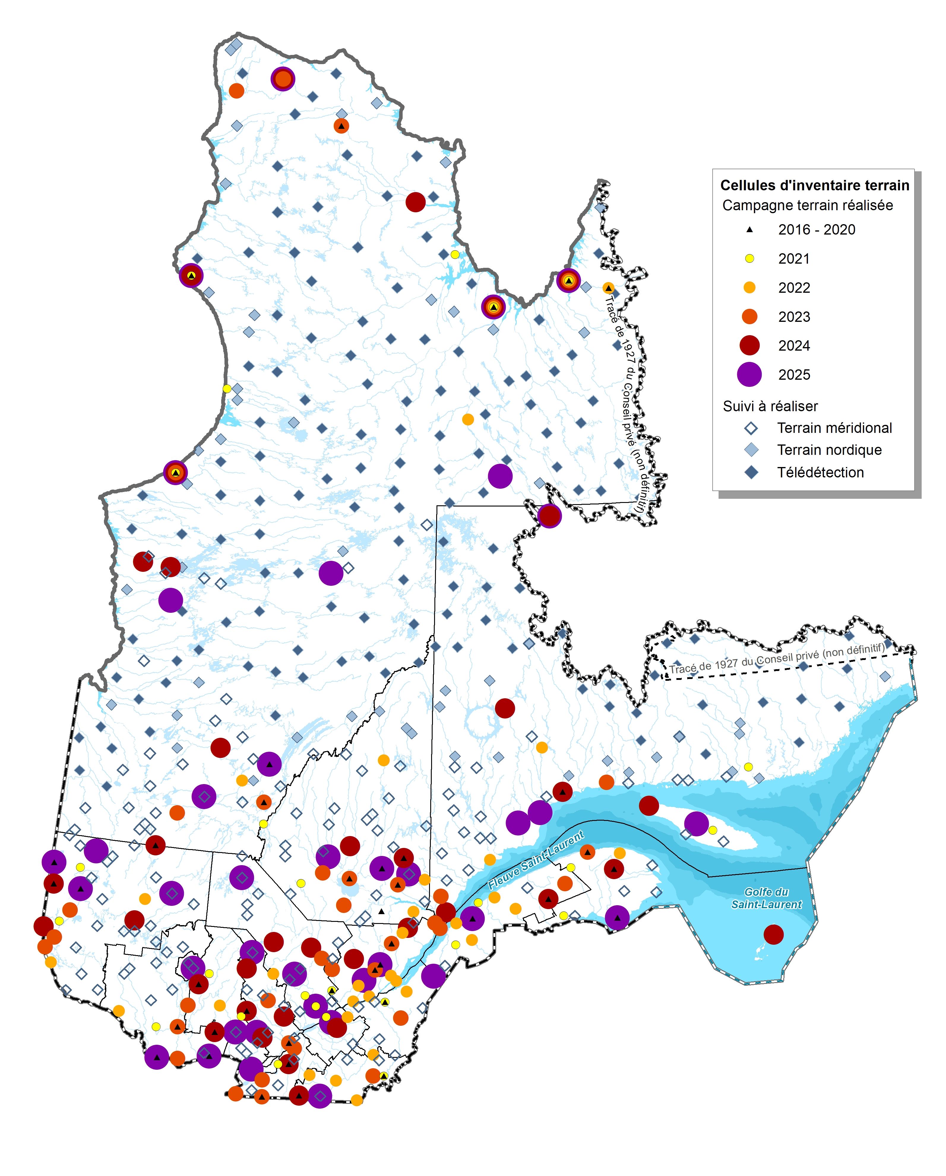 Les inventaires terrain ont débuté par un projet pilote en 2016 et 2017 et se sont ensuite multipliés avec l’intégration des équipes des directions régionales de gestion de la faune du MELCCFP et plusieurs partenaires (p. ex. Sépaq, Parcs Nunavik de Kativik, Nunavik Research Center de la Société Makivik).